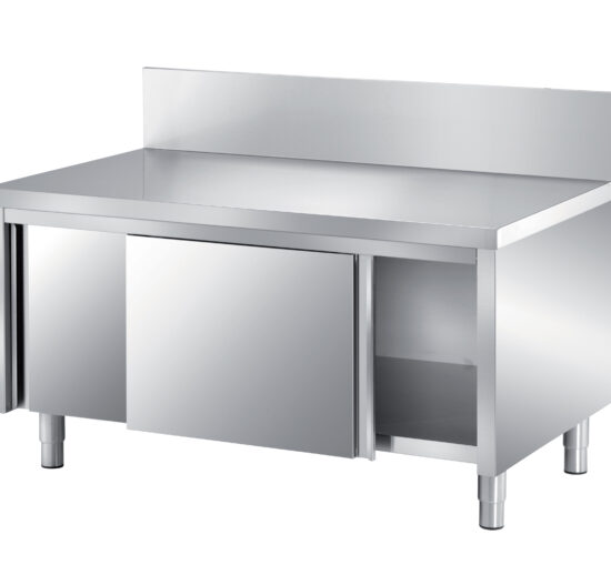 MEUBLE TRANCHEUR INOX 304, DOSSERET 200X20 MM PORTES COULISSANTES DOUBLEES, 1 ETAGERE