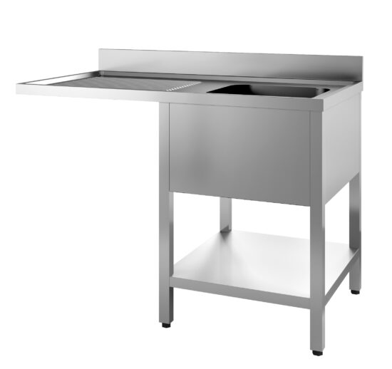 PLONGE INOX 304 SOUDEE, ENCASTREMENT LV BAC DROITE 1 BAC 600X500X300, EGOUTTOIR A GAUCHE AVEC ETAGERE