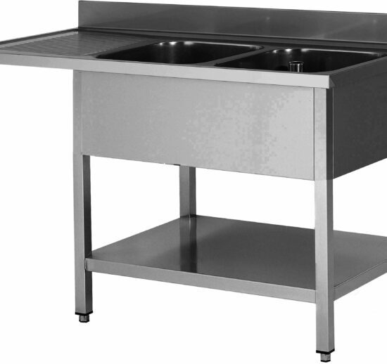PLONGE INOX 304 SOUDEE, ENCASTREMENT LV BAC DROITE 2 BACS 500X500X300 EGOUTTOIR A GAUCHE AVEC ETAGERE