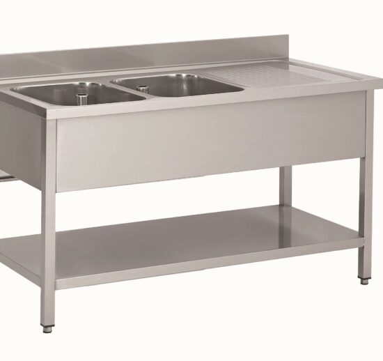 PLONGE INOX SOUDEE, 2 BACS 500X400X250 MM EGOUTTOIR A DROITE AVEC ETAGERE BASSE