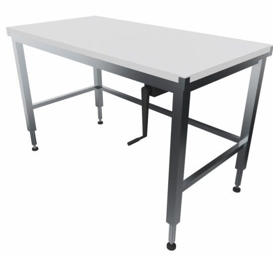 TABLE DE DECOUPE INOX 304 CENTRALE, DESSUS POLY NATUREL EP.25 MM REGLABLE EN HAUTEUR PAR MANIVELLE