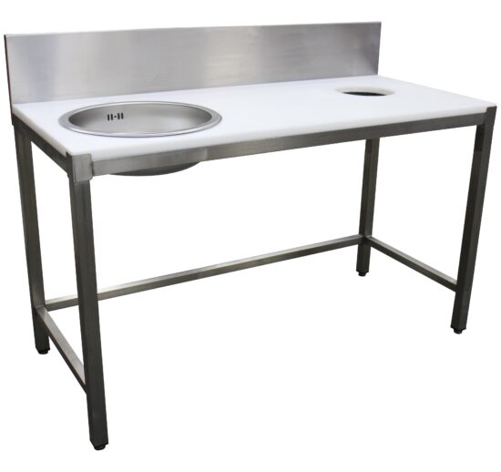 TABLE PREPARATION POISSON 1 BAC, SANS TIROIR DESSUS POLY BLANC EP.25 MM, DOSSERET 200X20 MM
