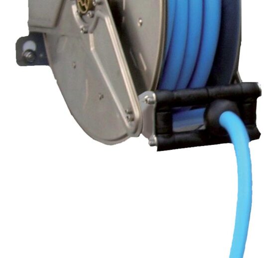 ENROULEUR AUTOMATIQUE INOX , TUYAU ALIMENTAIRE DE 10M BLEU AVEC EMBOUT ET COUPLEUR SANS PISTOLET
