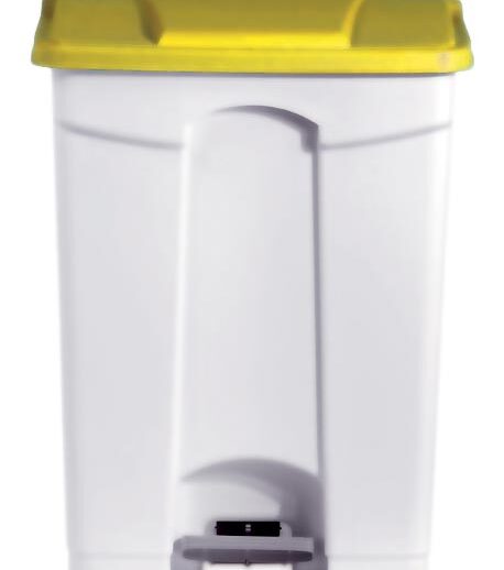 POUBELLE BLANCHE POLYPROPYLENE 90L COUVERCLE JAUNE ROULANTE, COUVERCLE JAUNE
