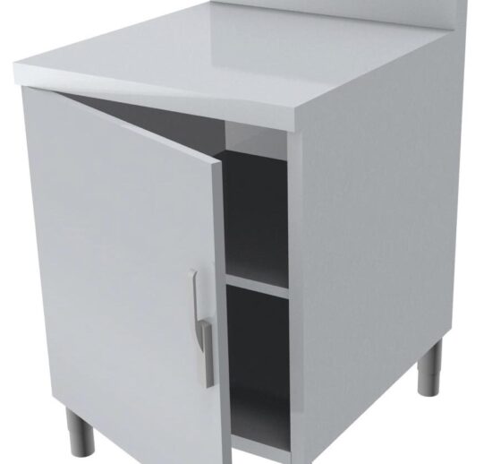 MEUBLE NEUTRE DESSUS INOX 304, 1 PORTE BATTANTE AVEC FERMETURE LOQUETEAU, DOSSERET INOX 150X50 MM