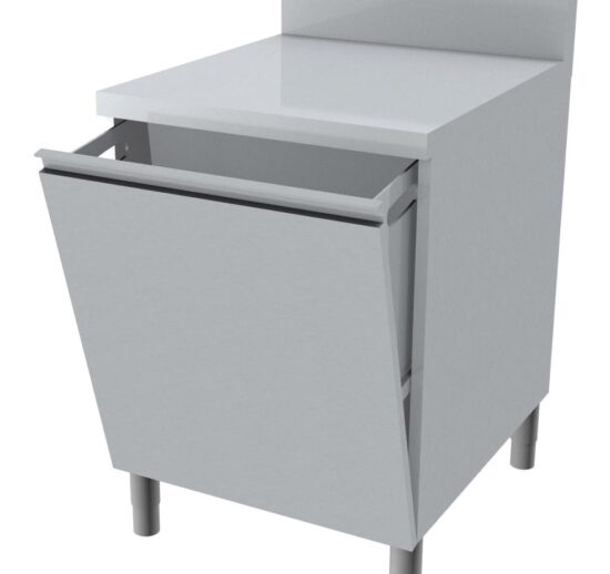 MEUBLE POUBELLE INOX 304, TIROIR COULISSANT+VOLET BASCULANT, DESSUS INOX, DOSSERET 150X50 MM