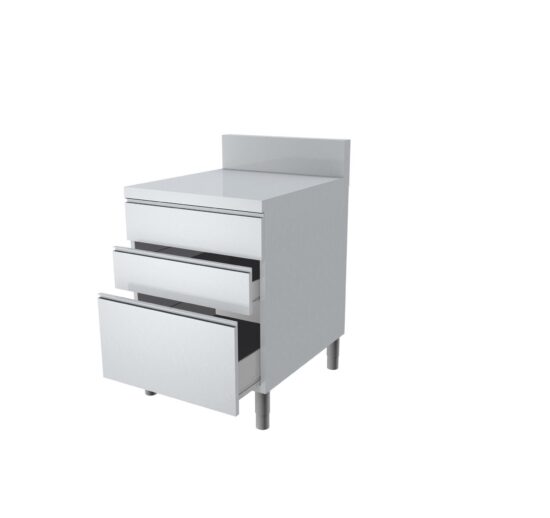 MEUBLE TIROIRS DESSUS INOX + DOSSERET 150X50MM DESSUS EP.40 MM 3 TIROIRS SUPERPOSES