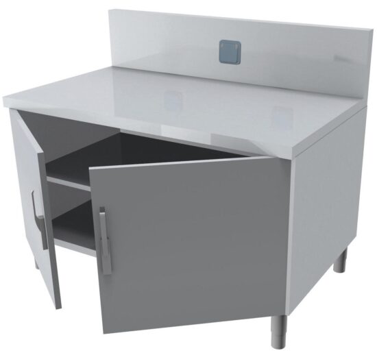 MEUBLE TRANCHEUR DESSSUS INOX, DOSSERET 250X50 MM AVEC 2 PRISES 230V INTEGREES, 3P.BATTANTES