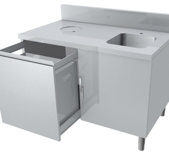 MEUBLE DE DECOUPE FROMAGE SURBAISSE INOX 304 DESSUS POLY BLANC EP.20 MM, P. BATTANTES LOQUETEAU