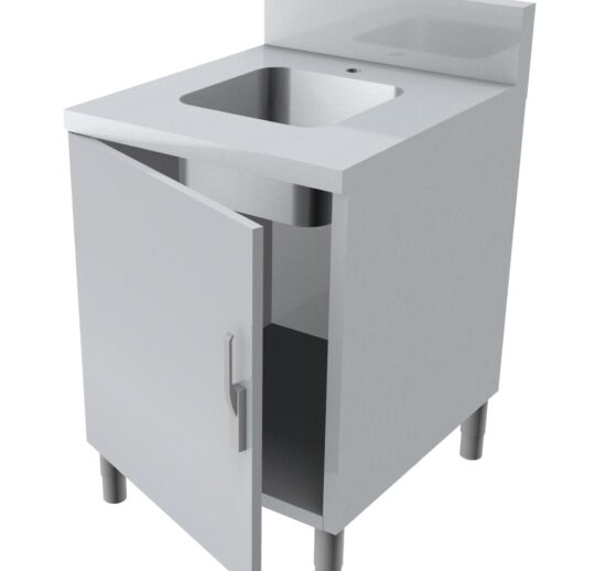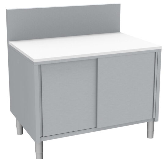 MEUBLE DE DECOUPE FROMAGE SURBAISSE INOX 304 DESSUS POLY BLANC EP.20 MM, PORTES COULISSANTES