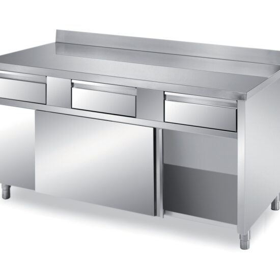MEUBLE BAS INOX 304 ADOSSE, 2 PORTES COULISSANTES ET 3 TIROIRS SUR GLISSIERES