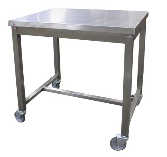 TABLE DE SERVICE INOX 304 SOUDEE, CENTRALE, 4 ROUES DONT 2 A FREINS