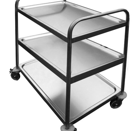 DESSSERTE SOUDEE INOX 304, 3 PLATEAUX 4 ROUES PIVOTANTES DONT 2 A FREINS CHAPE POLY