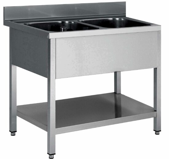 PLONGE INOX 304 DEMONTABLE, 2 BACS 500X400X250 MM PIEDS CARRES, SANS EGOUTTOIR , ETAGERE BASSE
