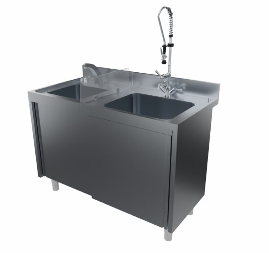COMBINE PLONGE/LAVE-MAINS AVEC SEPARATION VERRE, DESSUS INOX 304, DOSSERET ARRIERE 100X20 MM,