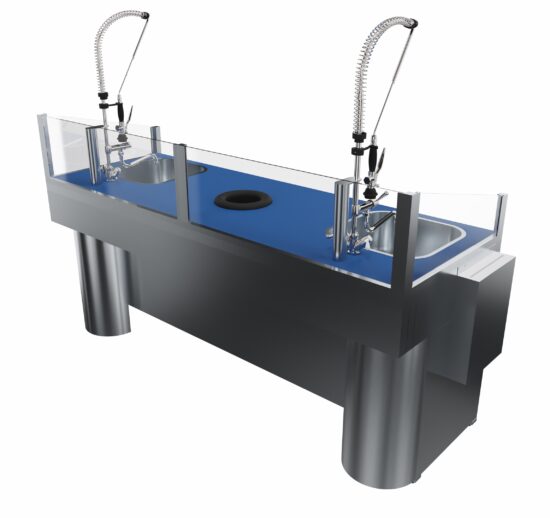 COMBINE DE PREPARATION POISSON DOUBLE POSTE DESSUS POLY BLEU AVEC DEUX BACS 400X400 MM