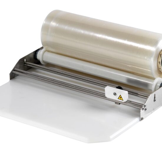 DEROULEUR DE FILM ETIRABLE INOX, AVEC PLAQUE POLY, LAIZE 460 MM, COUPE PAR CUTTER