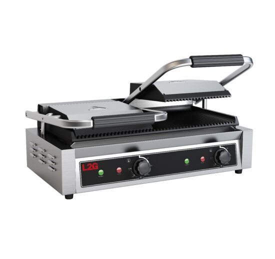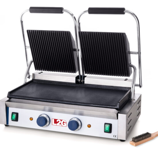 GRILL PANINI DOUBLE DESSUS RAINURE, DESSOUS LISSE FONTE REVETEMENT CERAMIQUE, S. CONTACT 475X230 MM