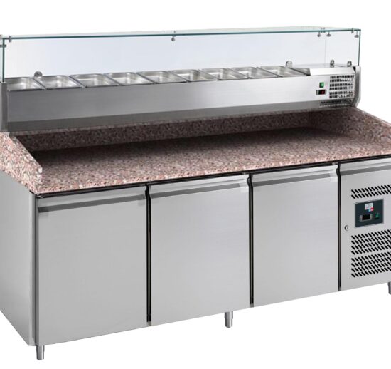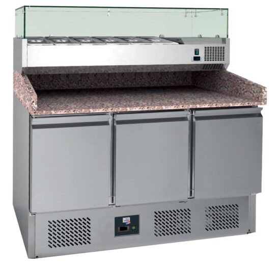 MEUBLE PIZZAS, 3 P. 600X400 MM, +2/+8°C, DESSUS GRANIT, AVEC VITRINE REFRIGEREE 9GN1/3-150