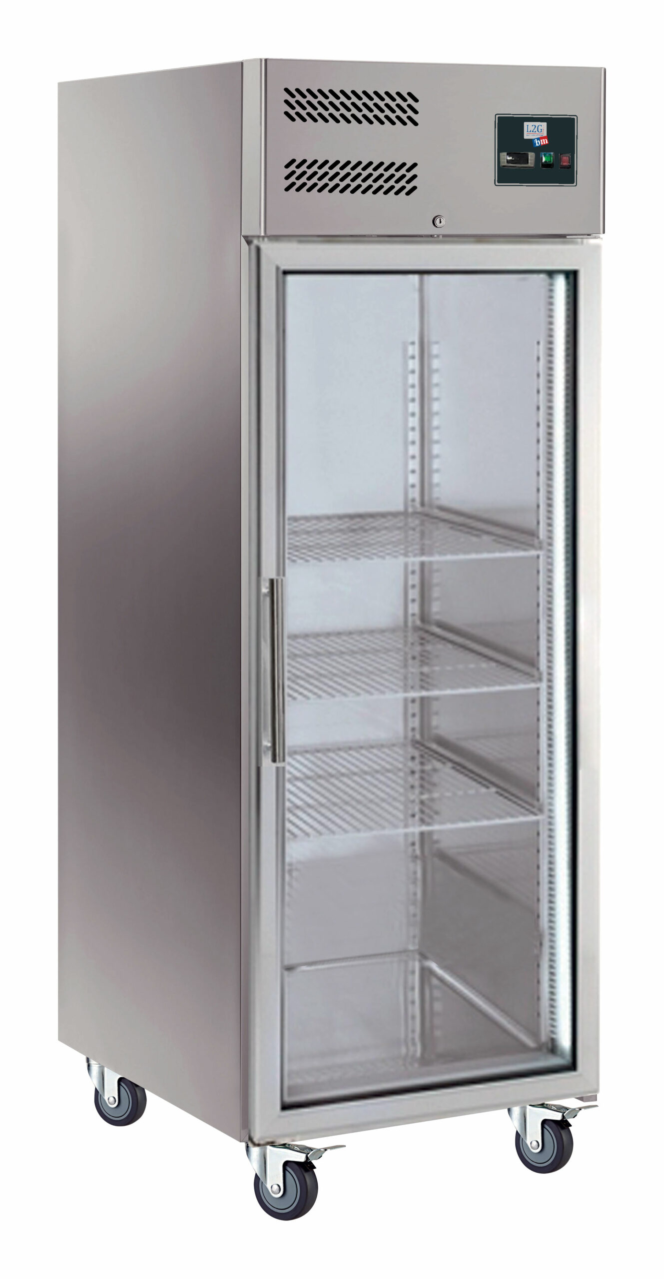 ARMOIRE REFRIGEREE INOX, 1 PORTE VITREE, -18/-22°C VENTILE, 3 GRILLES GN2/1, ROULETTES Ø100