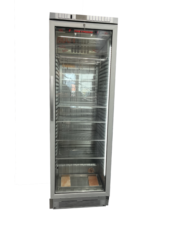 CAVE DE CONSERVATION POISSONS FUMES 0/+6°C A 25°C 60% HYGROMETRIE, EXTERIEUR INOX, 1 PORTE VITREE