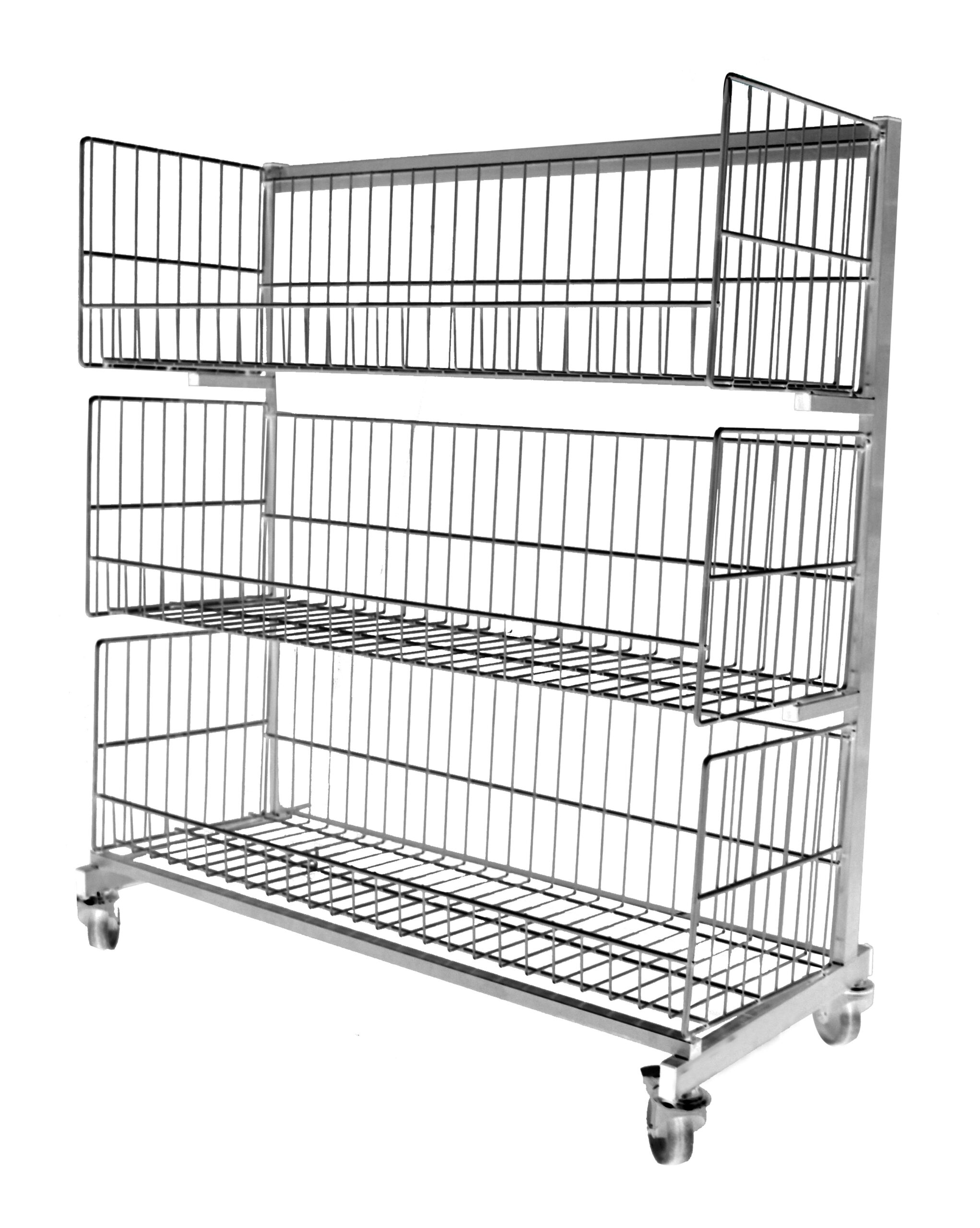 CHARIOT DE DEFOURNEMENT 3 NIVEAUX, INOX, SUR 4 ROULETTES CHAPE POLYAMIDE DONT 2 A FREINS D.100 MM