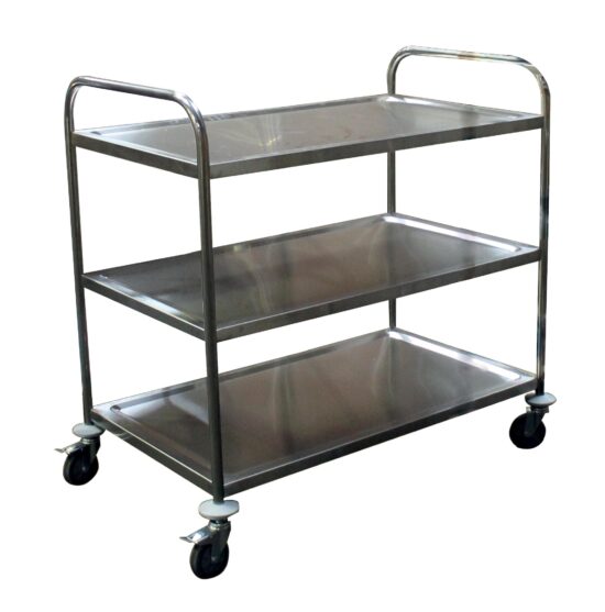 DESSERTE DEMONTABLE INOX 201, 3 NIVEAUX, 4 ROUES PIVOTANTES DONT 2 A FREINS