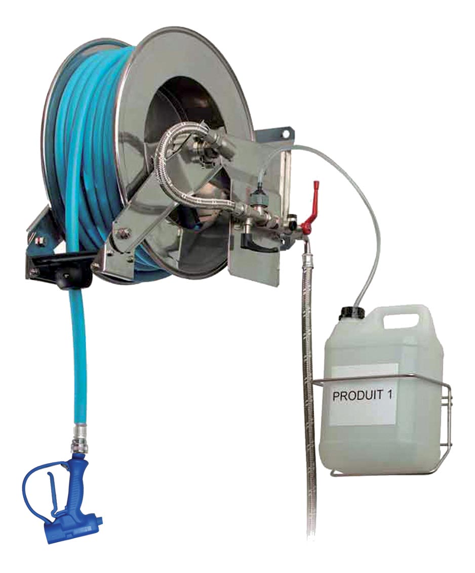 ENROULEUR AUTOMATIQUE INOX , KIT DE DOSAGE 1 PRODUIT, TUYAU DE 20 M, PISTOLET