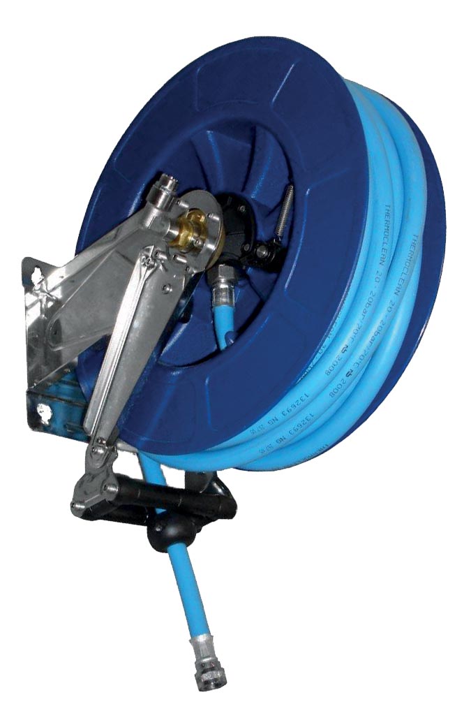 ENROULEUR MURAL STRUCTURE ABS ET INOX 304, TUYAU BLEU AGROALIMENTAIRE 15M SANS PISTOLET ANTICHOC