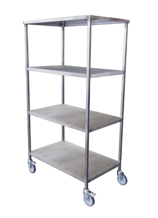 ETAGERE PLEINE INOX 304 4 NIVEAUX SPECIAL PAD SUR 4 ROULETTES D.125 CHAPE ZINGUEE DONT 2AF