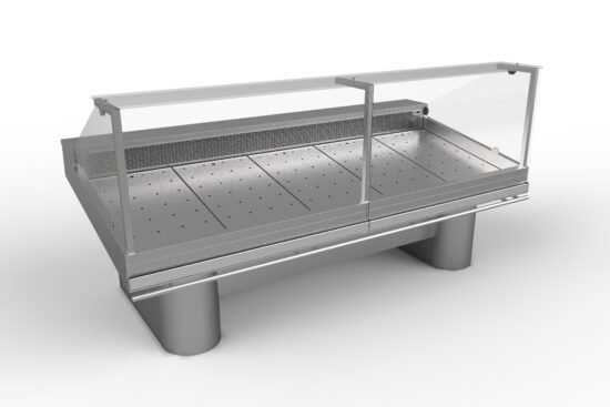 ETAL NEUTRE DROIT, INOX 304, VITRES BASSES DROITES BASCULANTES, PIEDS OBLONGS
