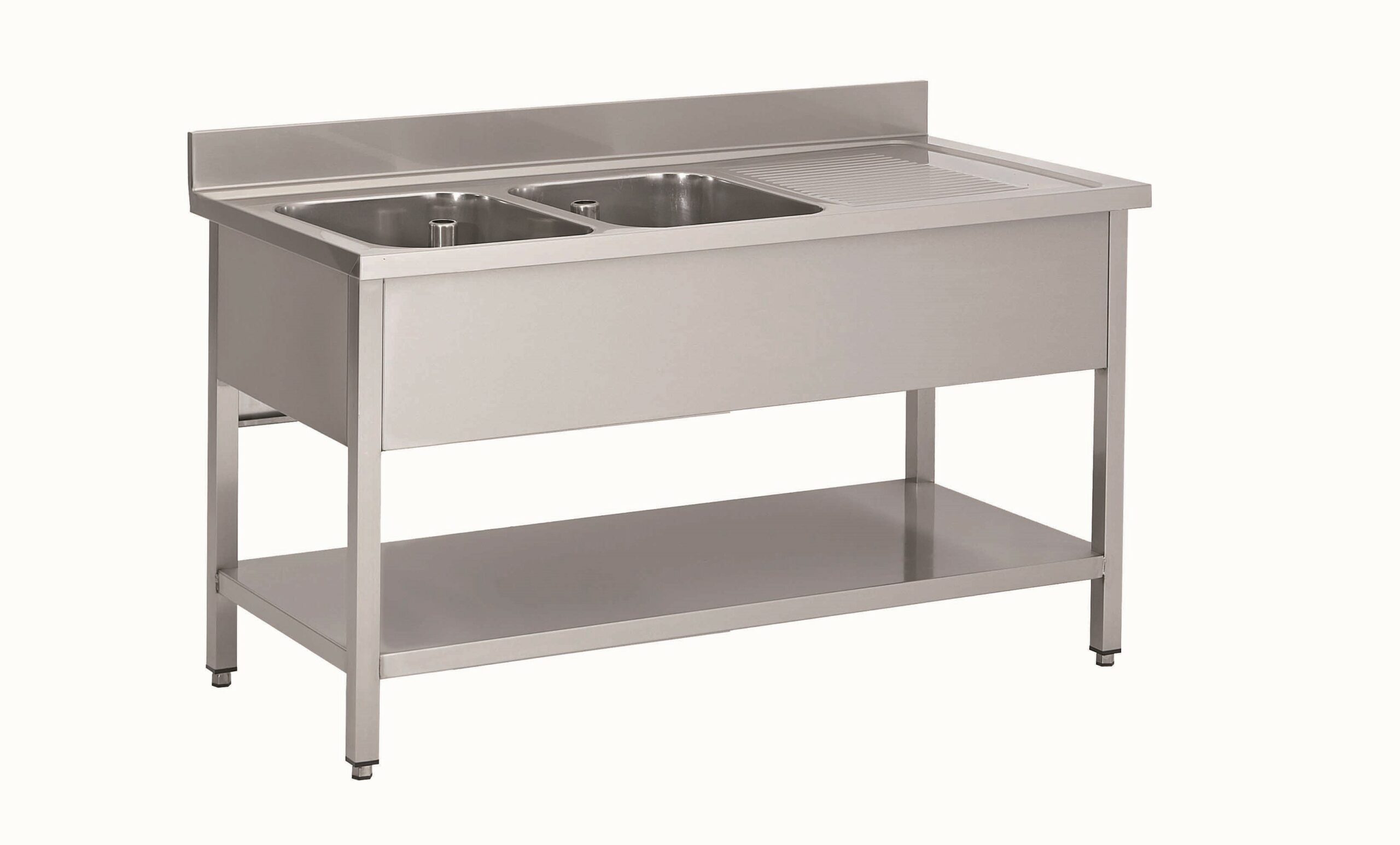 PLONGE INOX SOUDEE, 2 BACS 500X500X300 MM EGOUTTOIR A DROITE AVEC ETAGERE BASSE