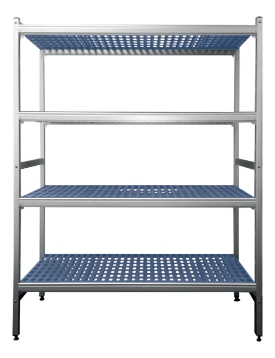 Etagère constituée de longerons et de plateaux polypropylène ajourés amovibles