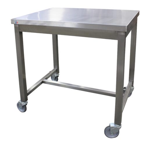 TABLE DE SERVICE INOX SOUDEE, CENTRALE, 4 ROUES DONT 2 A FREINS